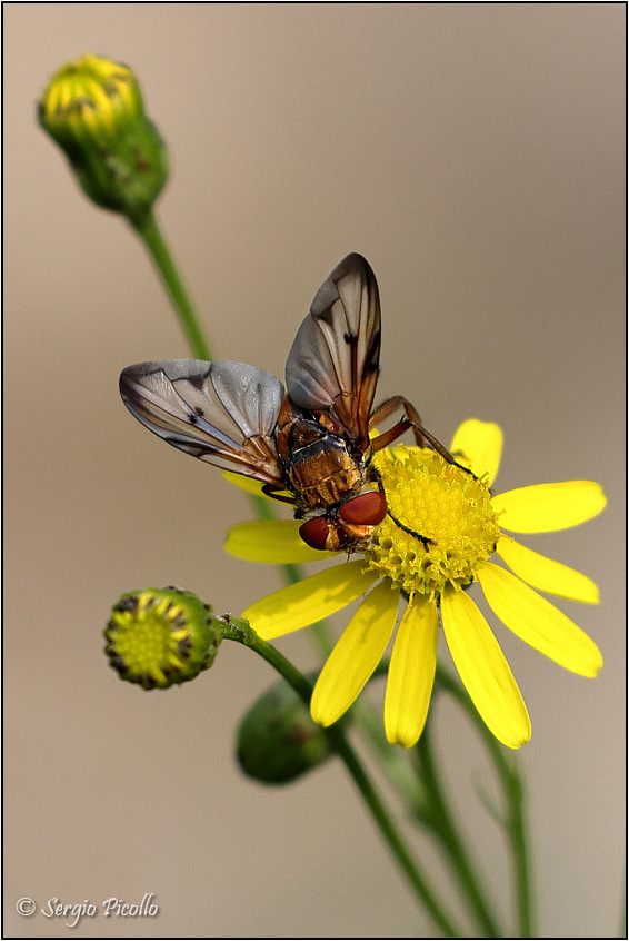 Ancora diversi impollinatori su fiori di Senecio inaequidens. Questo dittero mi sembra un Tachinidae, penso del genere Phasia. Si riesce a determinare la specie? Grazie.