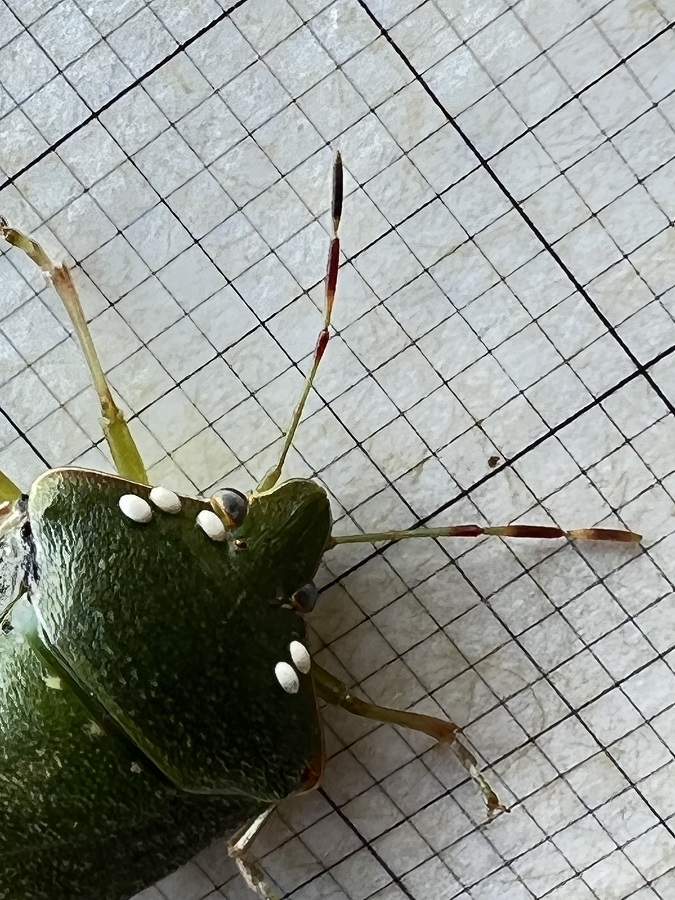 I cinque "punti bianchi" sul pronoto credo proprio che siano uova di parassitoidi (Diitteri Tachinidi).
