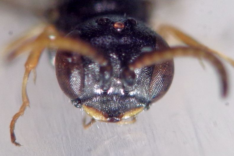 Seconda cattura "casalinga" di questo minuto crabronide (= friesei Kohl, 1901) di 3,6 mm, bottinante su Edera helix, assieme a Lindenius pygmaeus armatus v.d. Linden. Giuseppe aveva già postato un esemplare qui viewtopic.php?f=84&t=67704&hilit=Diodontus+hyalipennis . Anche questo è un maschio. Clipeo ottusamente biangoloso al centro, antenne largamente giallastre di sotto. Differisce dal maschio di minutus (F.) per il mesobasitarso poco allargato e non inflato all'estremità (quadretto rosso).