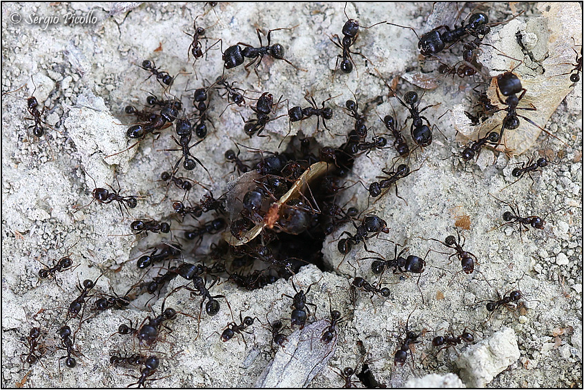 Ieri mentre cercavo di fotografare delle vespine indaffarate ad entrare ed uscire dal terreno, sono stato attratto da alcune formiche completamente nere. Due di diverse dimensioni, immagino della stessa specie ma con mansioni diverse, erano "abbracciate" nei pressi del formicaio in un atteggiamento apparentemente tranquillo (vedi foto), poi la più grande se n'è andata. Nei dintorni c'erano operai indaffarate a portare semi di acero verso il formicaio. Mi sapreste dire di chi si tratta?