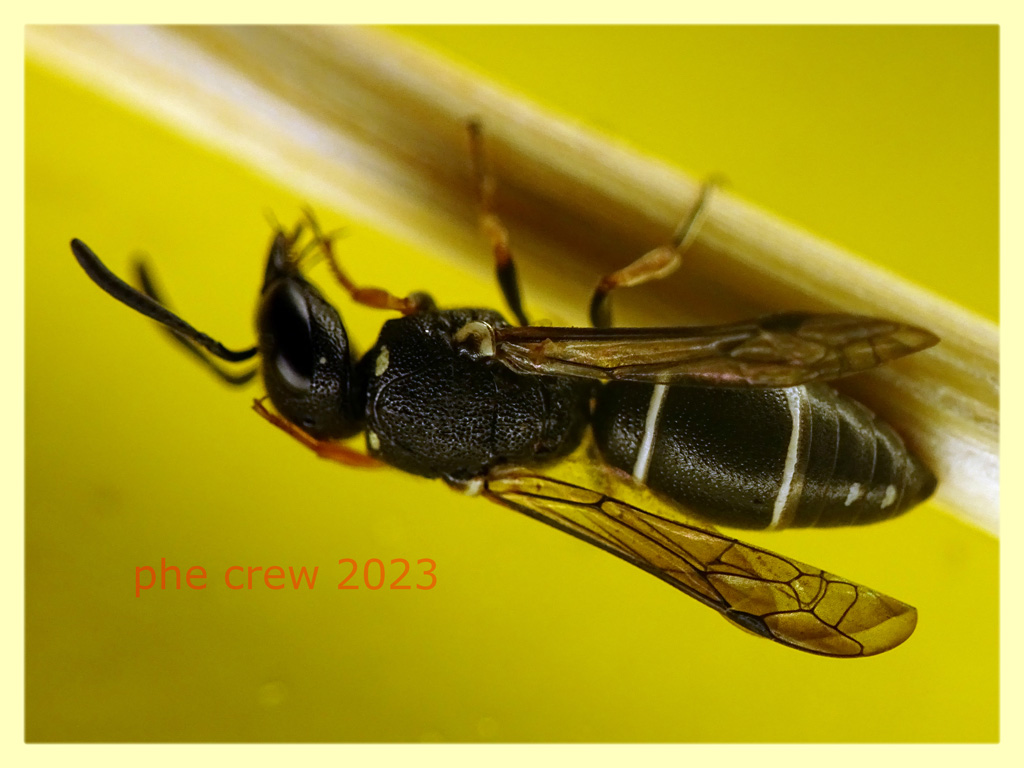 ...questo Imenottero si e' ripreso dopo aver ritirato dei piattini gialli. Siccome lo vorrei liberare, gli ho fatto due foto al volo...per sapere se e' interessante. Nonostante tutto in foto si stesse ripulendo, non e' riuscito a riadrizzare le ali,...forse si sono rovinate col sapone o successivamente nella soluzione salina...boh...comunque nella porzione di ala che si vede la venulazione mi porterebbe a Leptochilus sp....ma quale ? Se e' interessante lo tengo...per adesso gli ho messo un fiorellino e un goccio d' acqua :D
