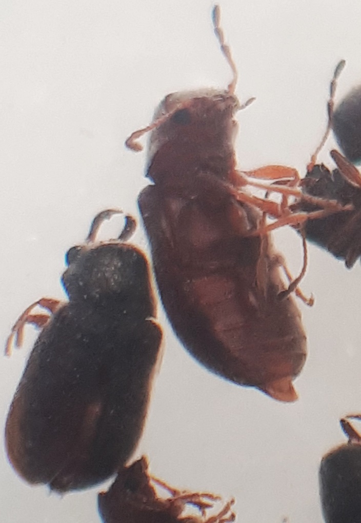 Il maschio (credo sia lui quello sulla sinistra!) ha due forti corna che partono dal margine anteriore del clipeo. Dimensioni 2mm. ca
