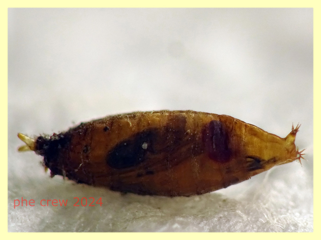 ...l' adulto si inscurisce (queste sono foto tra le 11:40 e le 12:00). A primo impatto sembrava essere una femmina di D. suzukii winter morph, cioe' soggetti di colorazione scura quelle di colore chiaro invece (leggendo sul web) sono attribuiti alla summer morph. Femmina perche' senza macchie sulle ali...ma guardando bene ha due spazzole sulle zampe anteriori...quindi un maschio e percio' ne maschio di D. suzukii (che hanno macchie sulle ali e spazzole sulle zampe anteriori) e quindi nemmeno femmina di D. suzukii (che non ha macchie e nemmeno le spazzole). Purtroppo il soggetto, mentre facevo altre foto, mi e' sfuggito (forse nemmeno totalmente inscurito)...ma per fortuna stamani mi e' sfarfallato il secondo esemplare ...che freezero' per ulteriori dettagli sperando che sia un maschio come questo.