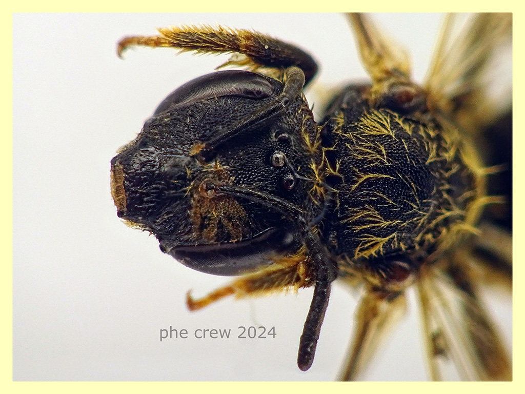 ...credo sia un Halictus sp., misura 11 mm. Anch' esso trovato affogato in un secchio abbandonato e riempitosi d' acqua in un prato. Per adesso ho fatto solo queste foto, si riesce a fare un passo avanti con qualche altro dettaglio ?