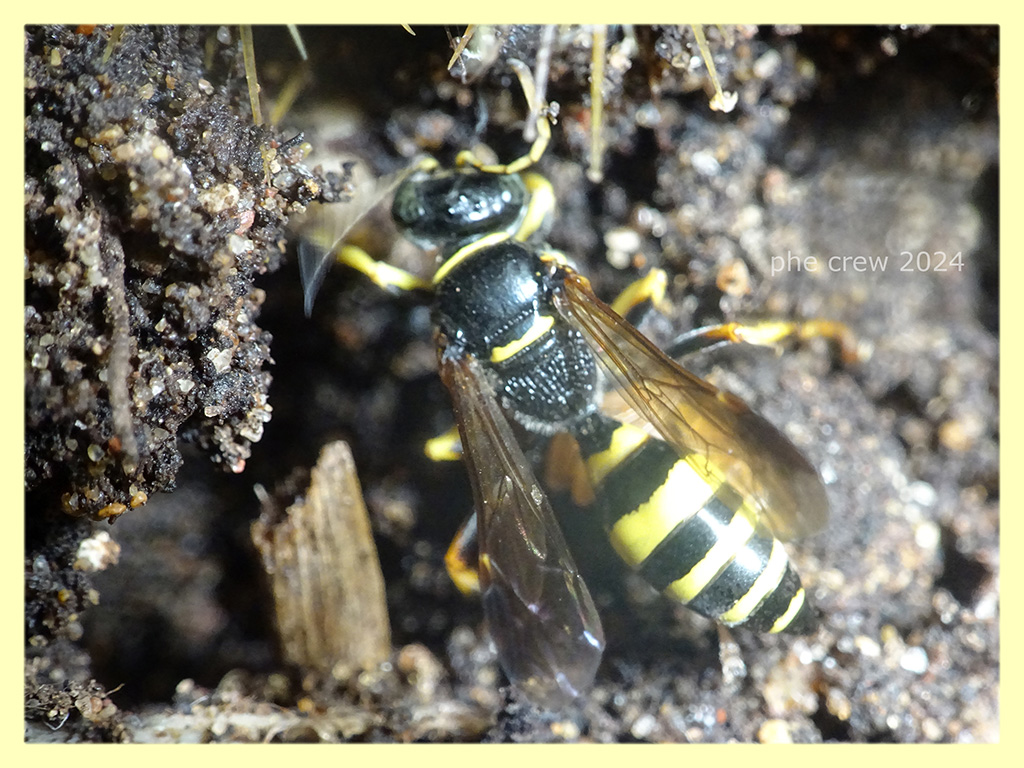 ...ogni tanto, quando non ho niente da fare, mi metto ad osservare gli Imenotteri scavatori che gironzolano tra piante e vasi. Seguendo due chiavi diverse arrivo, per questo Crabronidae, a una femmina di Gorytes laticinctus. Una specie comune, ma che non avevo mai avuto tempo di fotografare. L' ho osservata mentre portava le sue prede nel cunicolo che aveva scavato nel terreno. Per ogni preda portata riapriva l' entrata precedentemente chiusa con un po di terra. I suoi viaggi variavano dai 10 ai 20 min. fino ad arrivare anche ai 30 min.