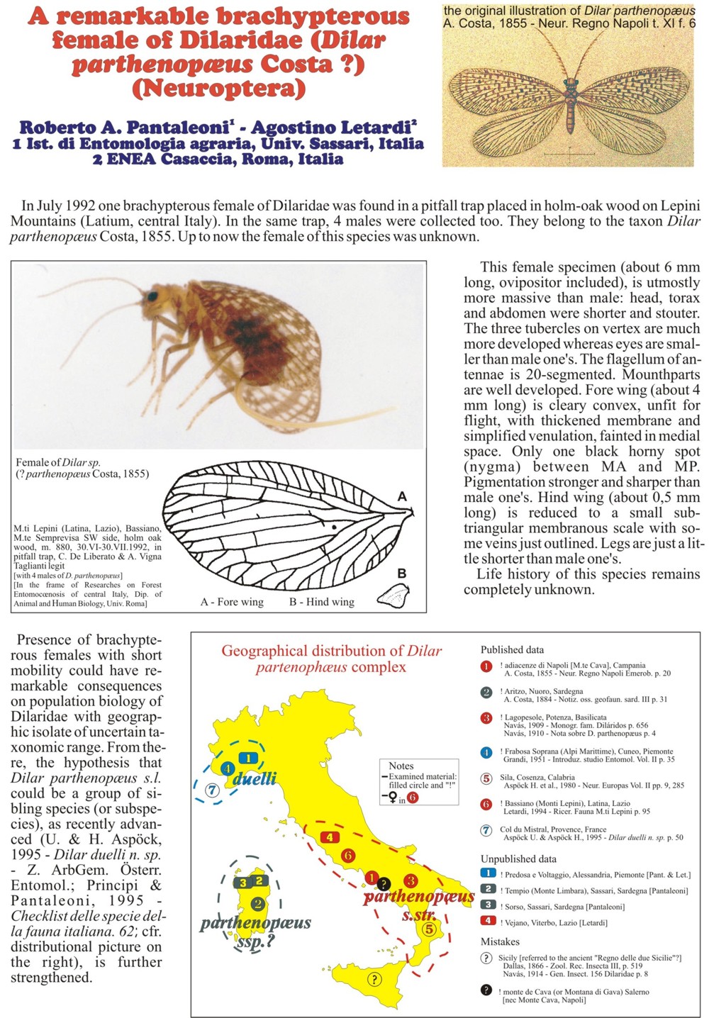 Già... per quel che ne sappiamo sinora (ovvero molto poco :( ), solo Dilar parthenopaeus tra i Dilaridae europei ha una femmina con le ali così ridotte. Non ti saranno sfuggite le antenne diverse e la presenza dell'ovopositore che tanti problemi tassonomici crearono nel passato di questi insetti....