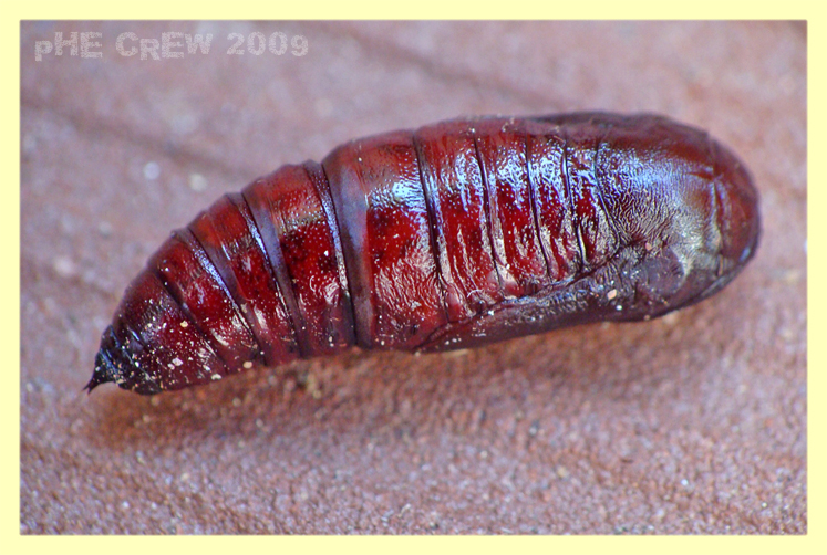 Qui c'e' l' esuvia e due scatti della pupa ancora fresca su i due lati, si noti il cambiamento di colore che tende allo scurimento man mano che passano le ore.