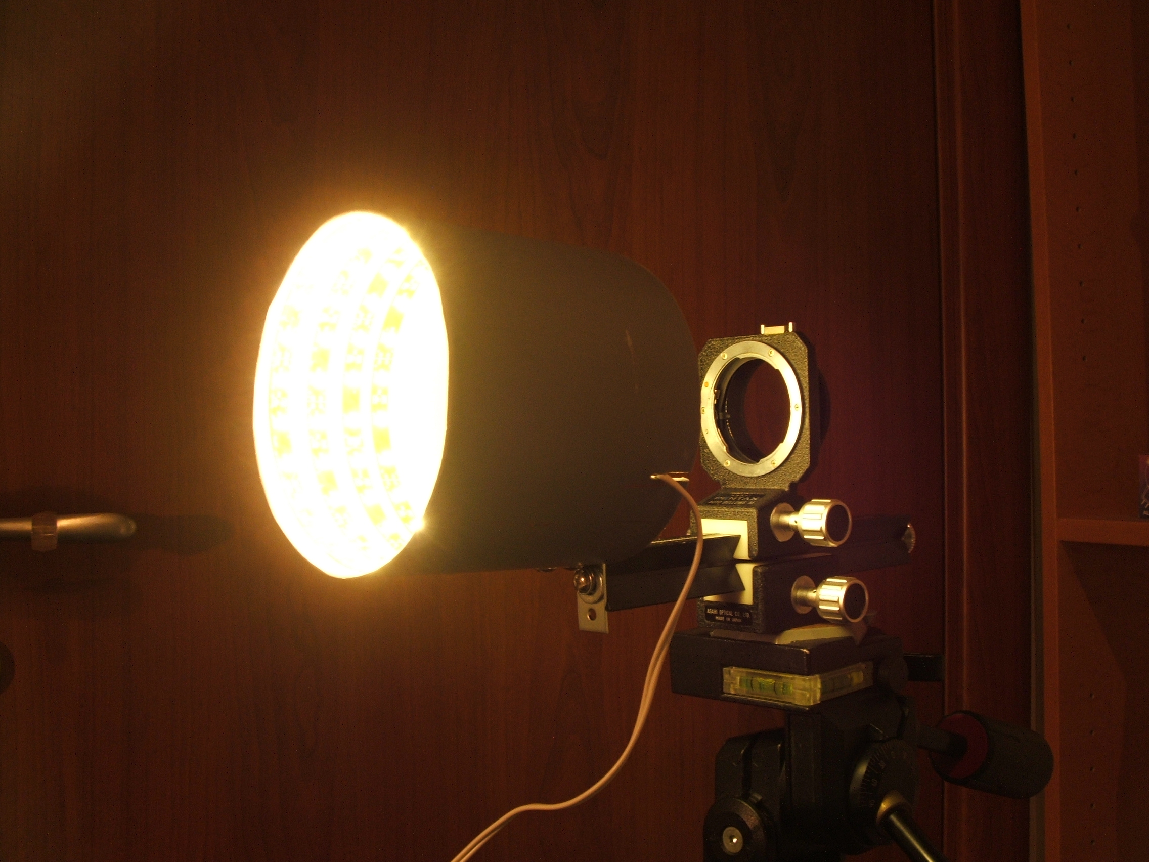 Credo che la spesa più rilevante sia stata quella dei LED (45 Euro al metro), poi saranno inezie. Un "accrocco" di questo tipo, alto 10 cm, immagino che si possa usare sia per fotografare su stativo che al binoculare.