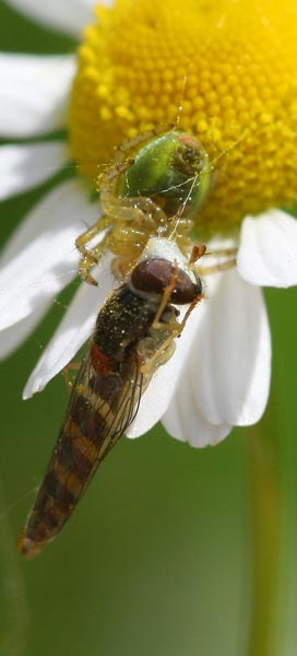 Il Syrphidae mi sa' che è una femmina di Sphaerophoria scripta (Linnaeus, 1758). il ragno ho paura che con solo una visione ventrale non sia facile. Comunque sembrerebbe un Thomisidae.