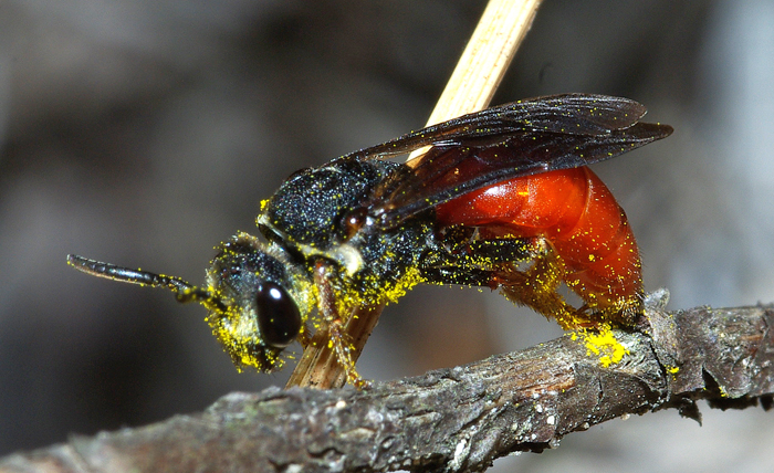 La maggior parte degli Sphecodes non sono determinabili su fotografia, forse uno specialista riesce a determinarne alcuni, personalmente sono in grado si determinarne soltanto una sottospecie, comune nella nostra isola (presente anche in Spagna e Portogallo) ma assente nella penisola e che ha una caratteristica unica: le zampe prevalentemente rosse.