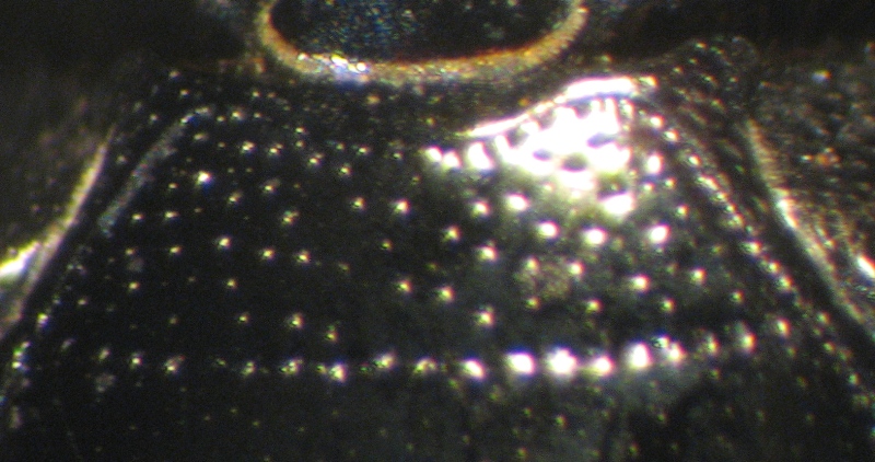 Vorrei solo sapere se il mesosterno (quello a forma di trapezio indicato dalla freccia) presenta punteggiatura fine e sparsa oppure, come credo, robusta.