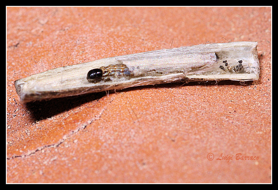 ero passato tante volte davanti al muretto di recinzione del vicino, ma non avevo mai fatto caso a delle pagliuzze lunghe poco più di 1 cm. Poi ho visto una che si muoveva, si intravedeva una testa che però prontamente spariva appena mi avvicinavo per fotografarla. Un attimo di pazienza ed eccolo nuovamente in cammino