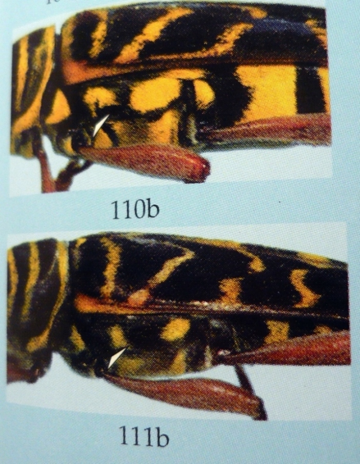 Era solo per conferma,la forte somiglianza con quest'altra specie: Megacyllene caryae è vanificata solo dalla presenza della stretta banda scura tra le due gialle allargate dei metaepisterni laterali (a volte anche completamente gialli).Il robiniae è più tardivo (June-November) del caryae (March-June).Per il resto si equivalgono a parte una leggera espansione del caryae verso il Northeast abbracciando tutto l'Ontario e buona parte del Quebec.Ti aggiungo un paio di foto tratte da : "Northestern Longhorn Beetles" di Douglas Yanega