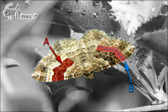 2) una linea mediana più scura attraversa tutta la zona chiara delle ali anteriori, dividendola a metà, dalla costa al margine interno ed è ben visibile (B), questa stessa fascia bianca con le stesse caratterisiche continua sulle posteriori. In E. rivata la fascia bianca è più larga sulle anteriori e ancor di più sulle posteriori e la linea mediana è generalmente solo accennata.