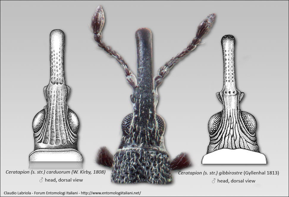 L'illustrazione che vi propongo è il ritaglio 100% della mia foto (purtroppo la tecnologia che ho a disposizione non mi consente di fare meglio :oooner:) e due illustrazioni prese da questo sito BioOne, l'articolo è "Larval Densities and Field Hosts of Ceratapion basicorne (Coleoptera: Apionidae) and an Illustrated Key to the Adults of Ceratapion spp. That Feed on Thistles in the Eastern Mediterranean and Black Sea Regions"