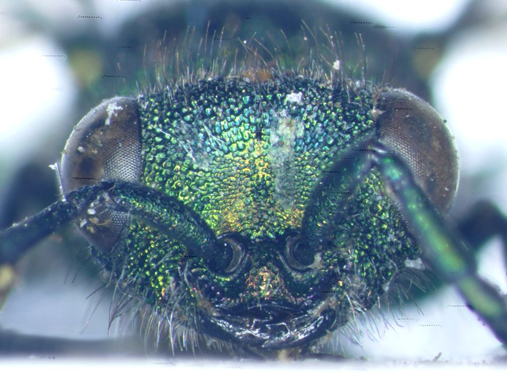 Chrysura hirsuta (Gerstaecker, 1869); i lunghi peli eretti si vedono solo in parte, in parte forse per colpa dello sfondo bianco che li fa sparire (quelli sul capo nella foto da davanti, col torace come sfondo, si vedono bene, ma in quella di fianco no) e forse anche perché in parte impastati e appiccicati sulla cuticola, però ad es. all'estremità dell'addome qualcuno si vede