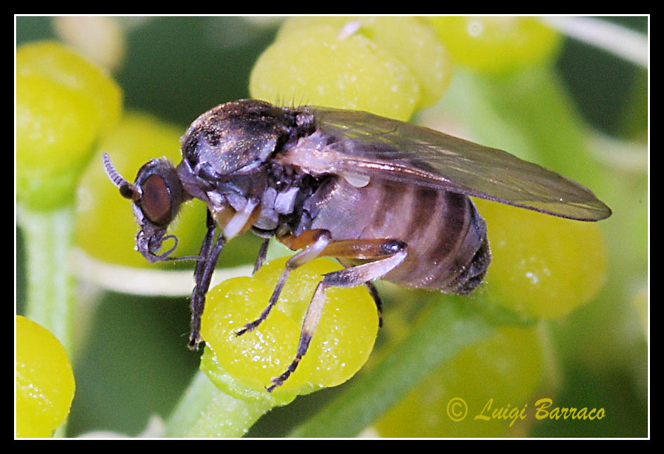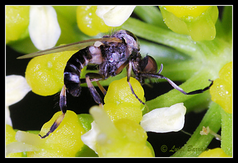 Indaffarati su una infiorescenza di apiacea, Smyrnium olusatrum, lungi circa 3,5 millimetri