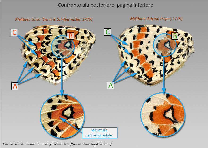Si notino i punti neri marginali di forma più o meno sub-triangolare in Melitaea trivia (A) e di forma tondeggiante in Melitaea didyma (A), la presenza della nervatura cello-discoidale in M. trivia (B) assente in M. didyma (B) e le lunule nere sottili e quasi unite tra loro in M. trivia (C), più spesse e separate in M. didyma (C).