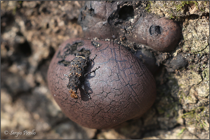 Oggi ho trovato questo piccolo coleottero (poco più di un cm) che gironzolava su un tronco a terra su cui stanno crescendo dei particolari funghi lignicoli a forma di grosse galle che sto tenendo d'occhio da alcune settimane perchè sono molto strani. Il fungo si chiama Daldinia concentrica e in sezione assomiglia ad una cipolla rossa tagliata anche se con colori sul nerastro. Ho trovato su un sito inglese che proprio di questo fungo in particolare si nutre il coleottero Anthribidae Platyrhinus resinosus e dalle foto sembra proprio lui ma è meglio avere una conferma dagli esperti. Grazie.